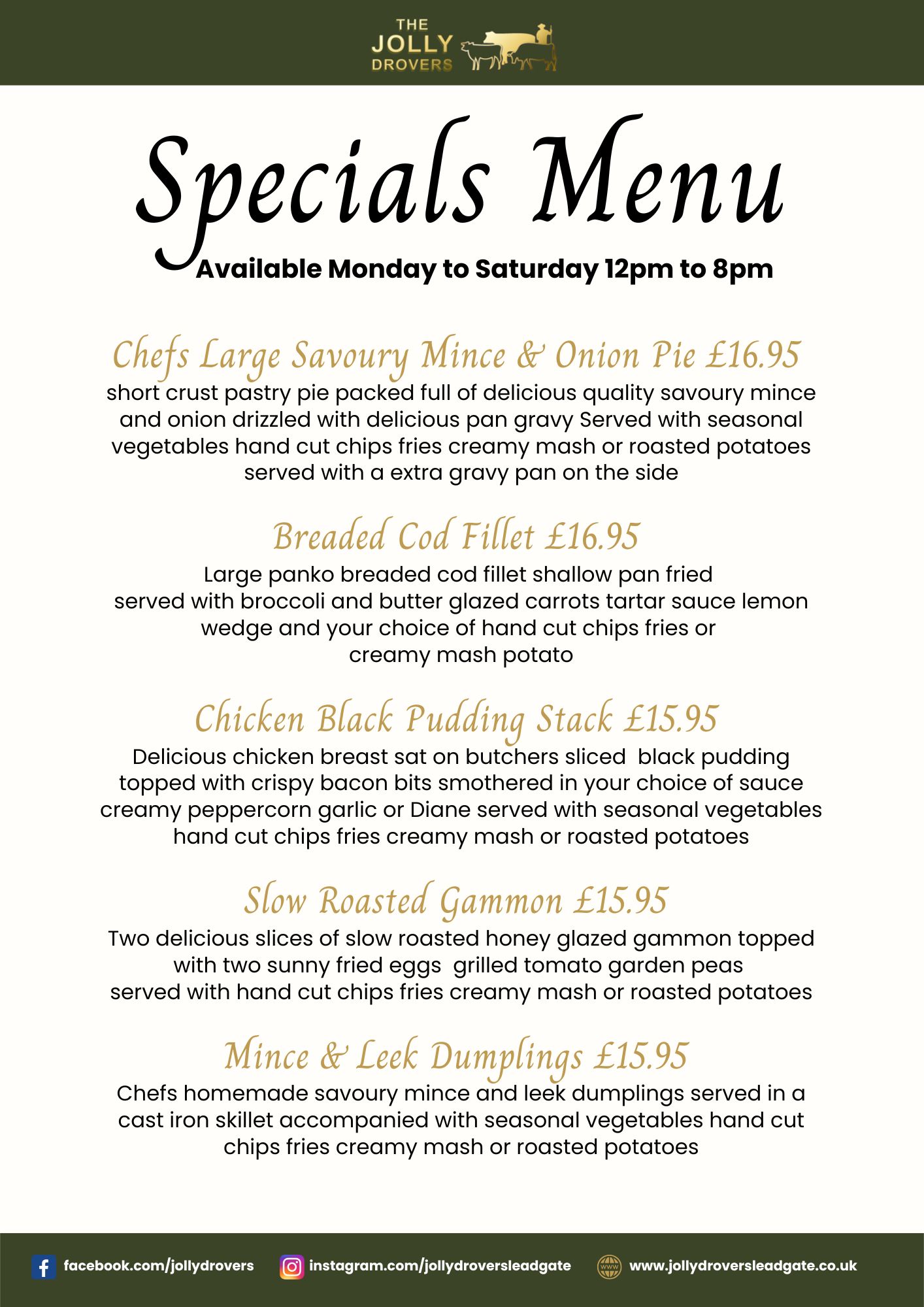 Our Special Offers Menus change regularly, giving you even more reasons to visit The Jolly Drovers. From great-value dishes to seasonal favourites, our offers are designed to give you excellent food at excellent prices.